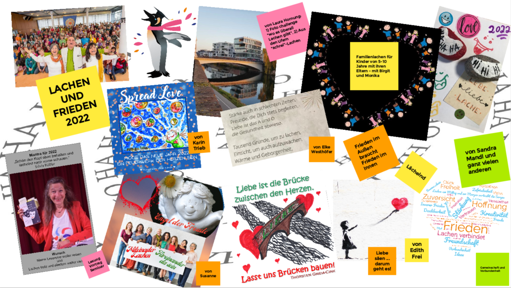 Gemeinsam haben wir eine Zielkollage LACHEN UND FRIEDEN 2022 erstellt, die wir mit vielen magischen, lachenden und friedvollen Momenten bestückt haben und mit unserem Lachen das besondere Quäntchen an Ziel-Energie geben haben. Sowohl persönlichen Visionen als auch Visionen für die Gemeinschaft fanden ihren Platz.